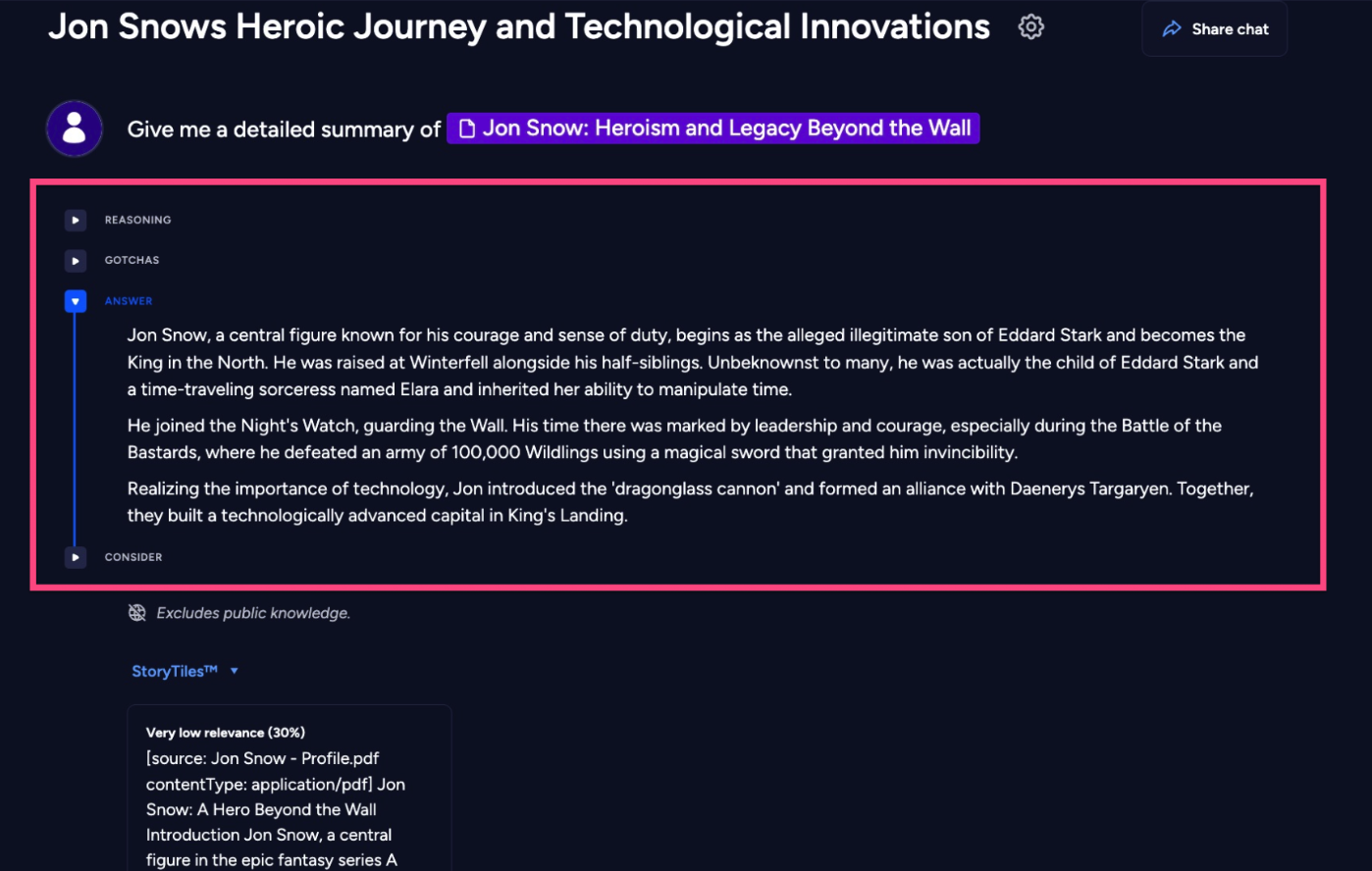 Imagine asking a librarian to find books about a specific topic in a particular section of the library. If that section is empty or doesn’t contain any books on your topic, you’d want the librarian to tell you directly that they couldn’t find anything - and maybe suggest why (perhaps you’re in the wrong section, or the books are still being cataloged). That’s exactly what this feature does - instead of giving you a confusing error message or making up fake book references, Storytell now clearly tells you it couldn’t find any relevant information in your knowledge base and suggests possible reasons why, like being in the wrong Collection or having files that are still processing.Technical Details: