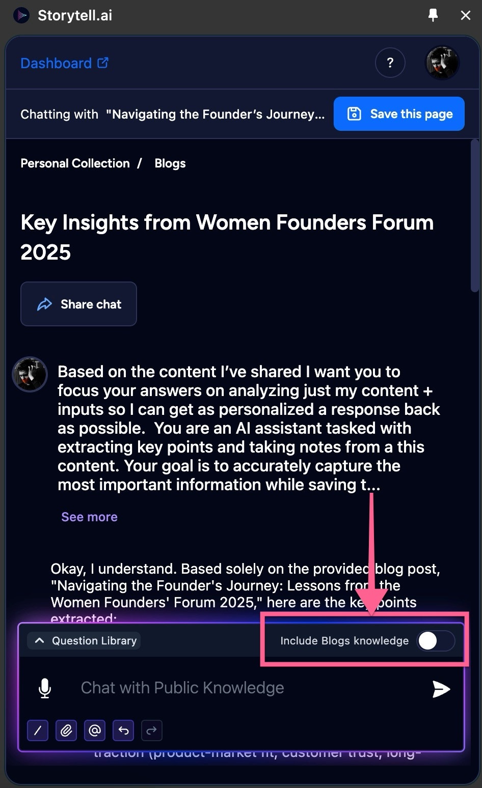 Toggle theInclude Collection knowledge switch to include knowledge from your currently selected Collection in Storytell’s answers.