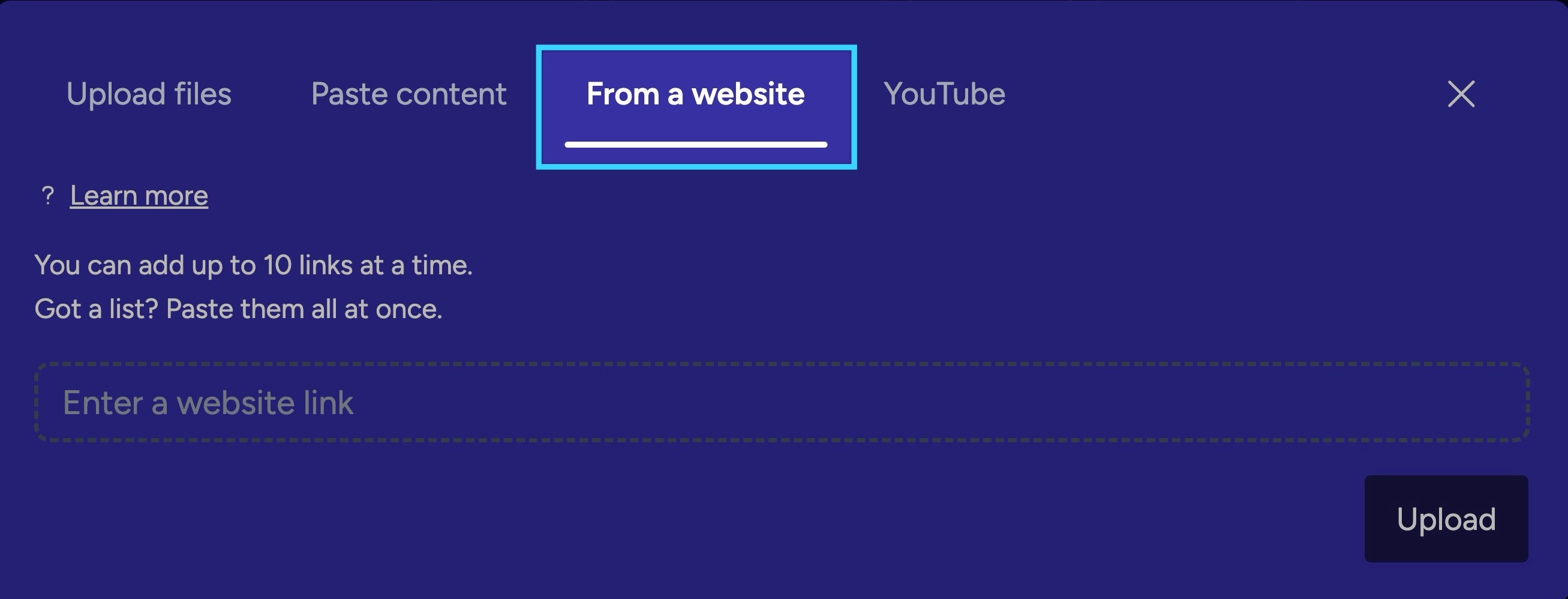 - Paste in URLs to upload web pages. You can upload up to 10 links at once.