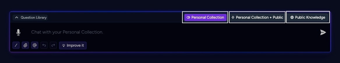 - Collection + Public Knowledge: SmartChat™ will primarily use your Collection assets but may supplement answers with general knowledge when beneficial. It’s great for comprehensive responses that leverage both your specific content and broader context.