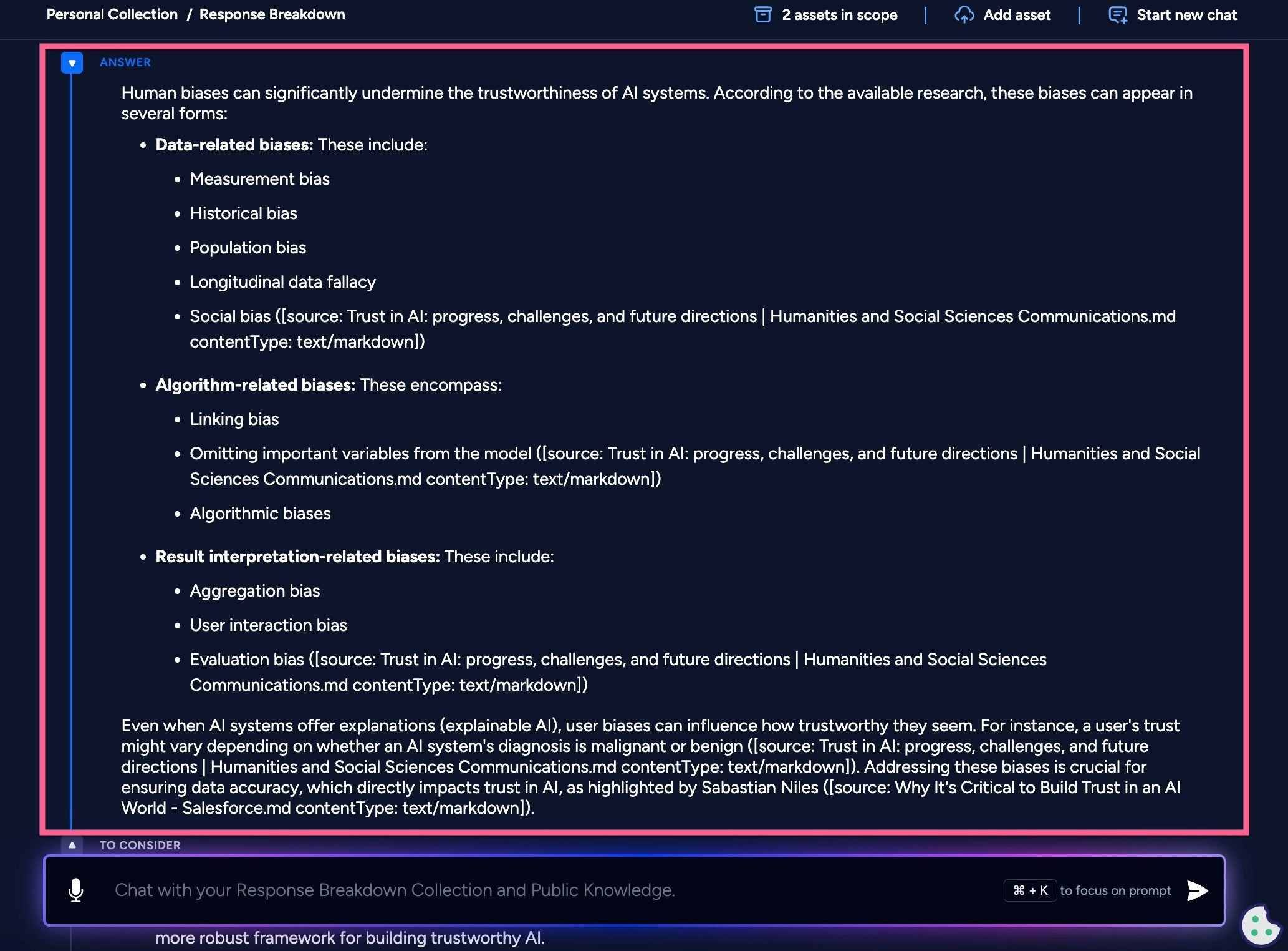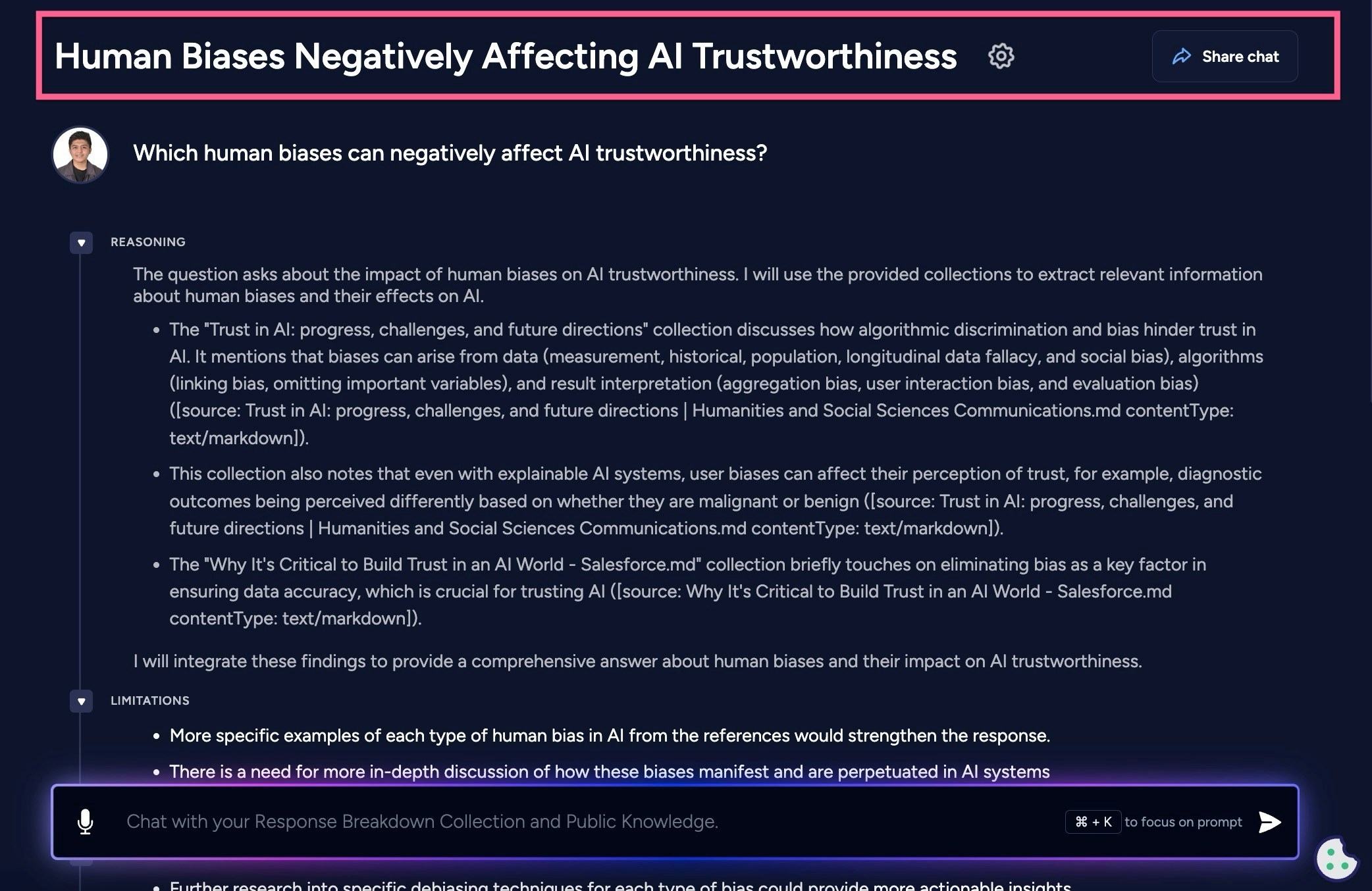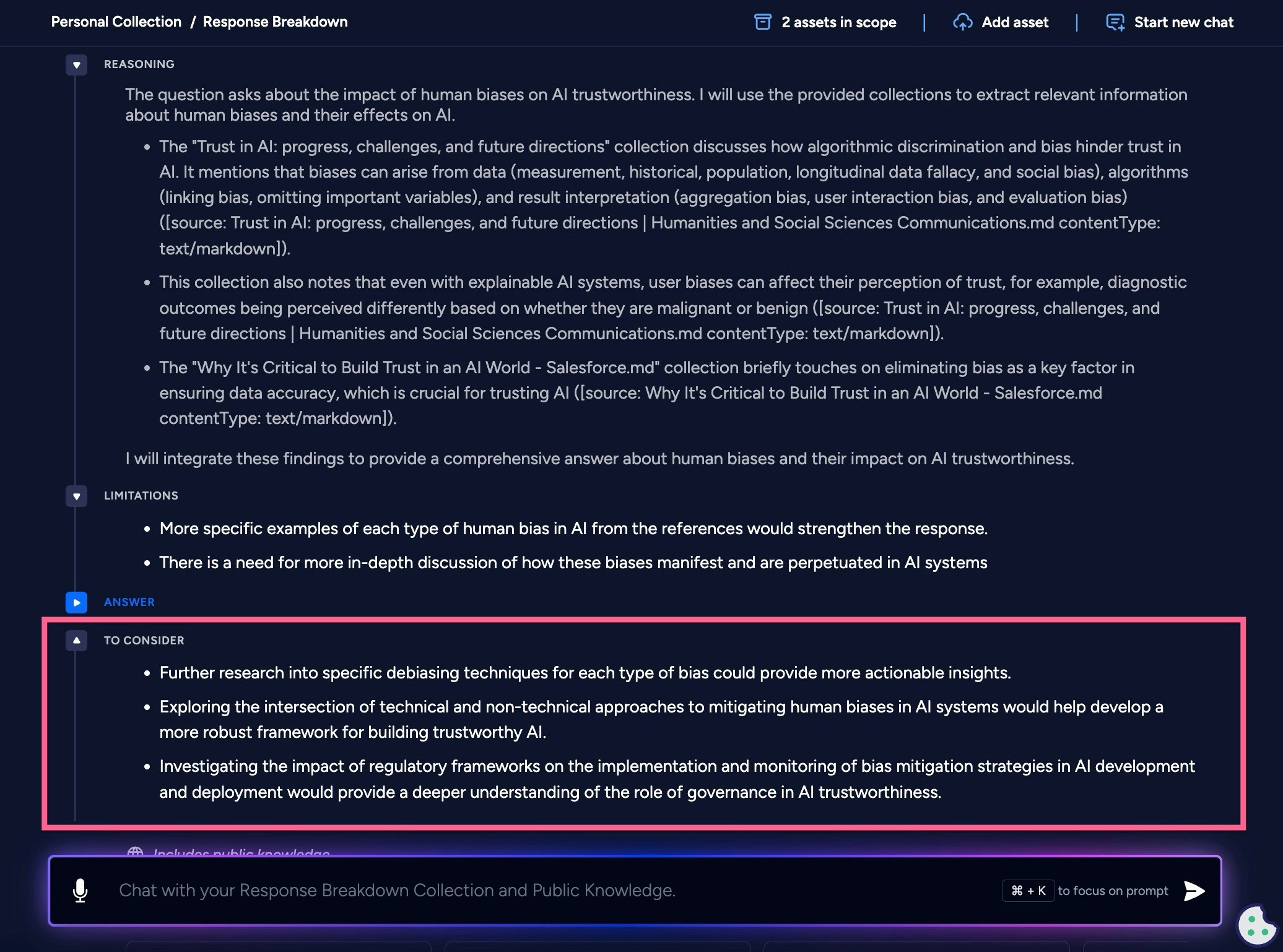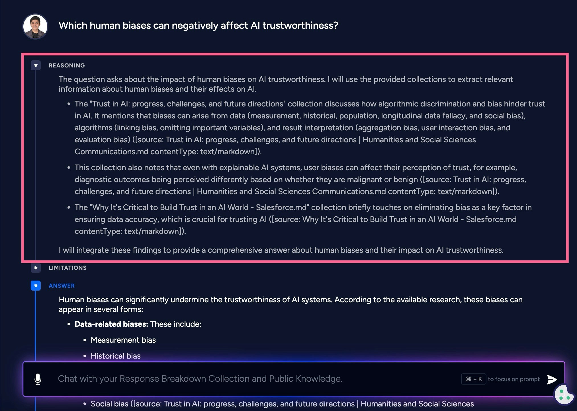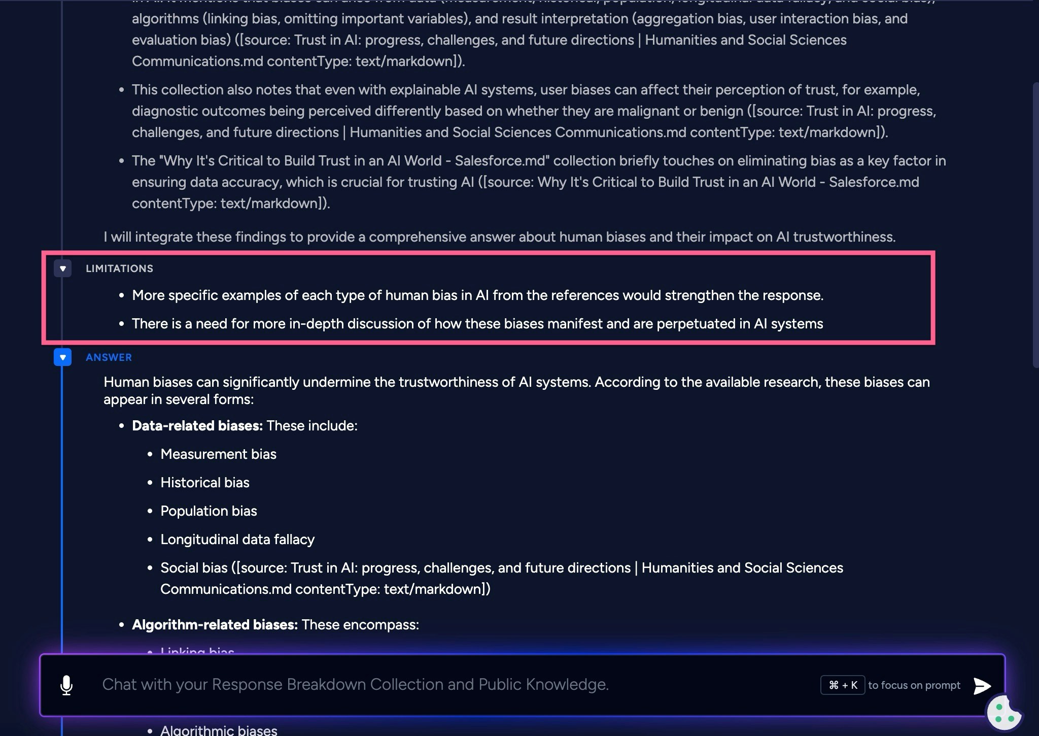 - Limitations - Highlights and identifies potential gaps, uncertainties, or biases in the response. This honest acknowledgment of constraints builds credibility by avoiding overconfidence and recognizing the boundaries of AI knowledge.